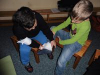 Frau Bruckmann erklärte unseren „Füchsen“, wie man kleine Wunden selbst versorgen kann und natürlich musste das auch geübt werden…