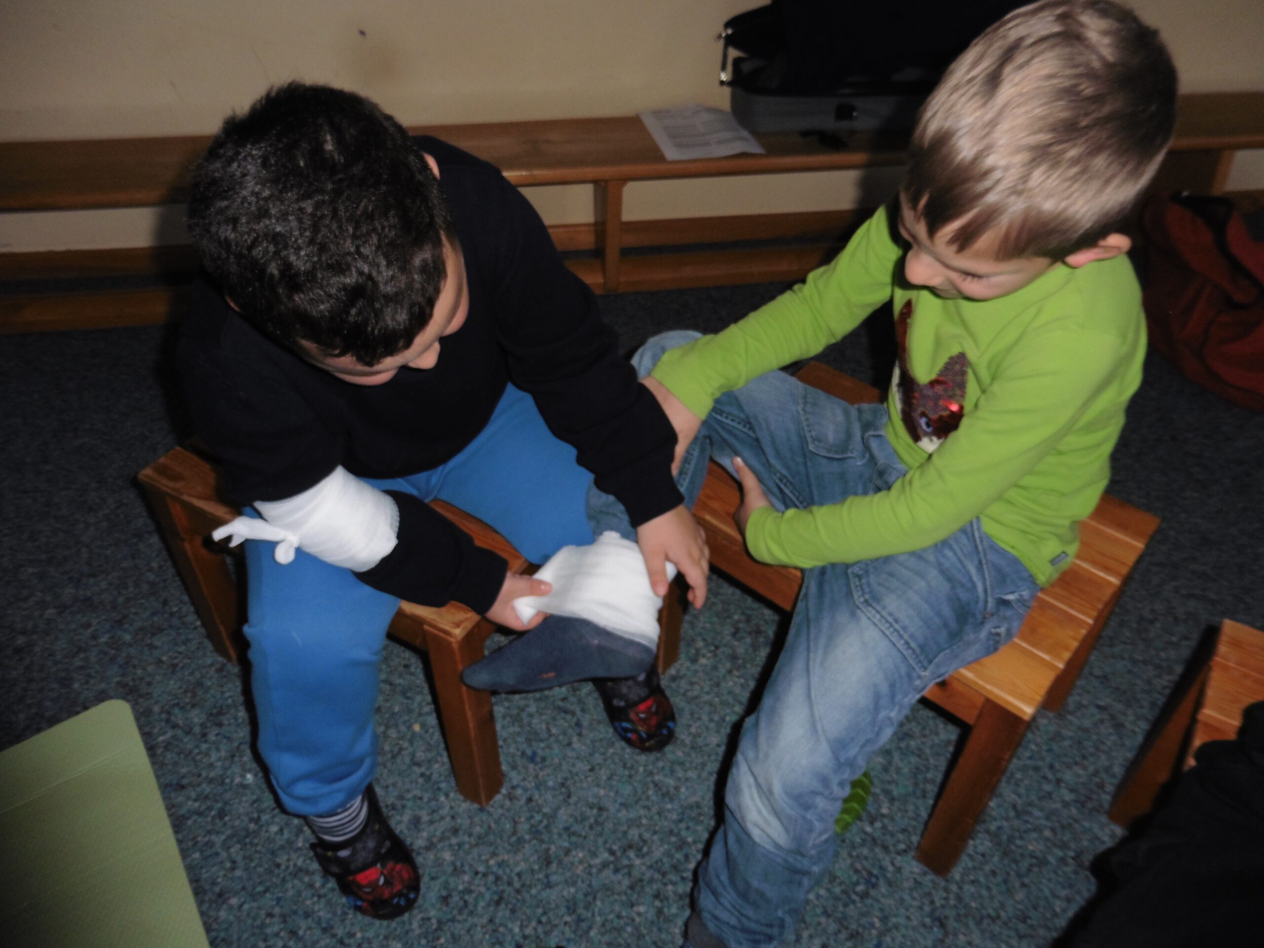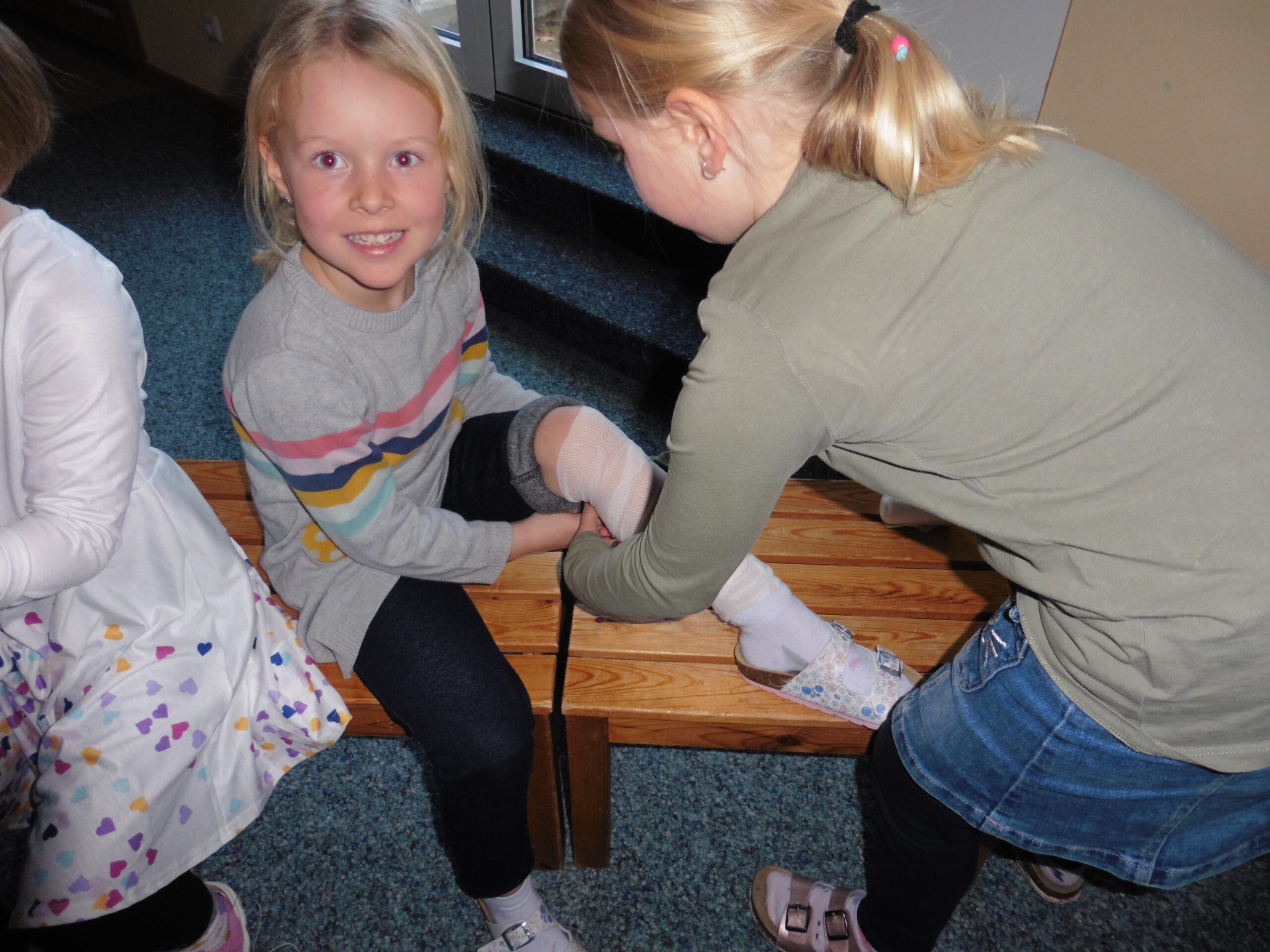 Frau Bruckmann erklärte unseren „Füchsen“, wie man kleine Wunden selbst versorgen kann und natürlich musste das auch geübt werden…